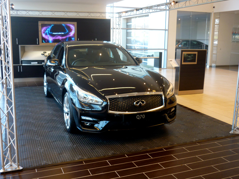 As part of the launch of their new Q70 car, Infiniti Cars required a display flooring solution for a display area in five separate showrooms across the UK in Birmingham, Glasgow, Leeds, Reading and Stockport. The all new Q70 is positioned under a spotlight lighting rig, they wanted to showcase a single car, raised off the standard showroom floor using the industrial, heavy-duty mats, which corresponded with its luxury sports image.