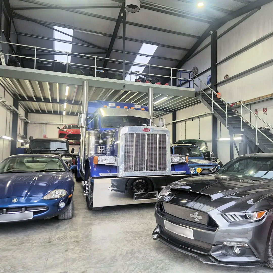 This crazy car cave comprises a real mezzanine floor with a full size kitchen, games consoles and 84 inch TV, full size snooker table and much more. The collection features small motorcycles, two Peterbilt semi trucks (one of which belonged to Chris Eubank); Three Mustangs, including a Shelby Super Snake (one of only 6 RHD manuals); One Ford Cortina Consul MK1 1962 with only 17000 miles (spent 53 years in a barn); One 1939 Bedford truck. An AC Cobra kit car; A Harvester International tractor (restored); Two Landrover Defenders; A Ferrari 308 GT. And a tuk-tuk for good measure!